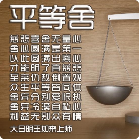 《平等舍–大日如来王尊佛》慈悲喜舍无量心,舍心圆满是第一。以此圆满出离心,才能明了真慈悲。至亲仇敌倒置观,众生平等皆同体。舍弃分别爱恨执,舍弃冷漠自私心,利益无别众有情。