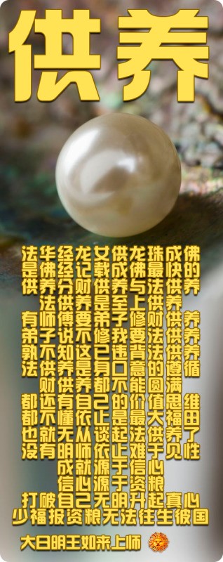 《 供养–大日如来王尊佛》法华经龙女供龙珠成佛,是佛经记载成佛最快的。供养分财供养与法供养。法供养是至上供养,有师父要弟子修财供养,弟子说不修我要法供养,孰不知这已违背法供养。法供养是身口意的遵循,财供养都不能圆满,都还有自己的价值思维,都不懂依止是最大福田,也就无从谈起法供养了。没有明师依止难于见性,成就源于信心,信心源于资粮。打破自己无明升起真心,少福报资粮无法往生彼国。