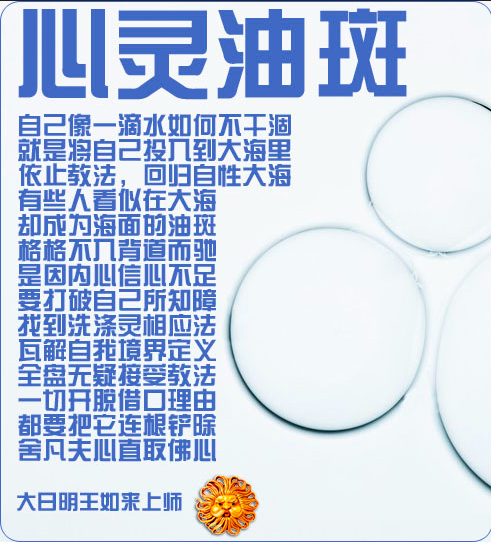 《心灵的油斑–大日如来王尊佛》如何让自己的一滴水不干涸,就将自己投入大海。意思是指已经发心修行的人,信心不足,菩提心不够,易动道心,要从形式皈依到心地皈依,投入上师三宝加持大海,跳出小我,获得法性重生。 但有一个很关键的问题,你是不是一滴水?很多人都是一滴油,即便跳入大海,还是格格不入。因为私心无法融入博爱。 ————大日如来王尊佛 上师语音开示 http://www.drmwss.cn/wp-content/uploads/2023/11/13.248心灵的油斑.mp3 文章导航 双重枷锁