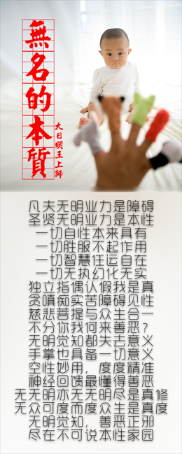 《无明的本质–大日如来王尊佛》凡夫无明业力是障碍,圣贤无明业力是本性,一切自性本来具有,一切胜服不起作用,一切智慧任运自在,一切无执幻化无实。独立指偶认假我是真,贪嗔痴实苦障碍见性。慈悲菩提与众生合一,不分你我何来善恶?无明觉知都失去意义,手掌也具备一切意义。空性妙用,度度精准,神经回馈最懂得善恶。无无明亦无无明尽是真修,无众可度而度众生是真度。无明觉知,善恶正邪,尽在不可说本性家园。