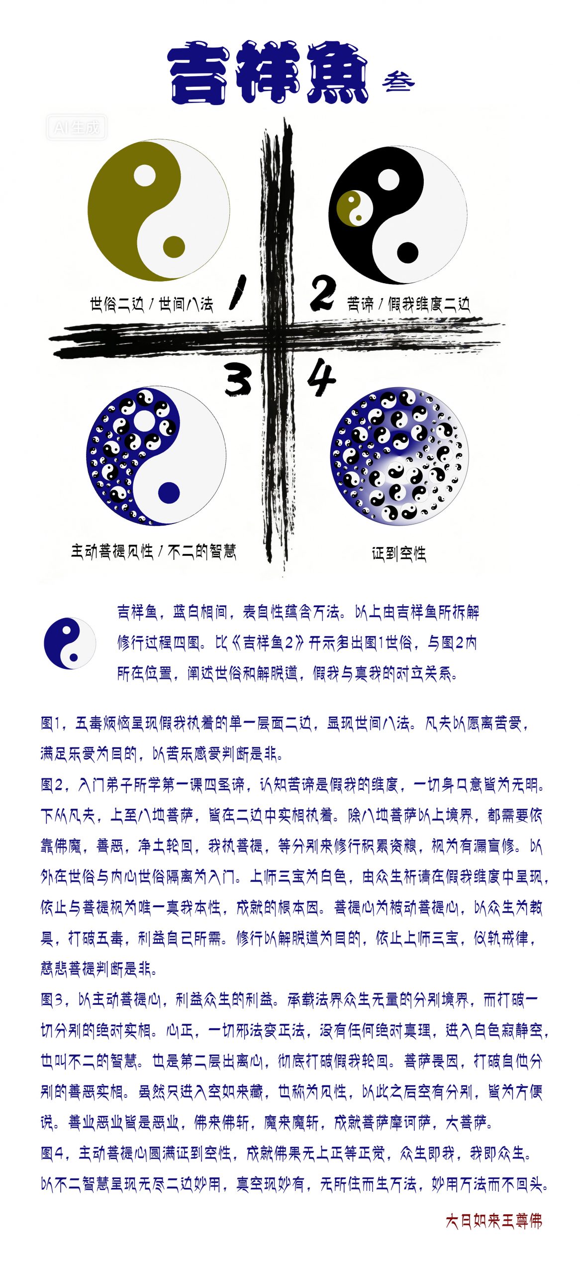 《吉祥鱼3—-大日如来王尊佛》吉祥鱼,蓝白相间,表自性蕴含万法。以上由吉祥鱼所拆解修行过程四图。比上以开示多出图1世俗,与图2内所在位置,阐述世俗和解脱道,假我与真我的对立关系。